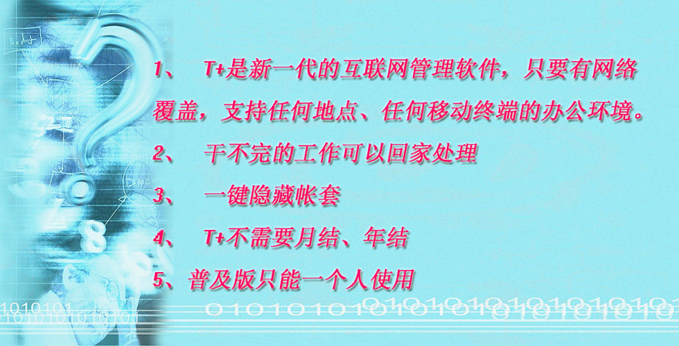 畅捷通T+是一款新型互联网企业管理软件。 全面满足成长型小微企业对其灵活业务流程的管控需求,重点解决往来业务管理、订单跟踪、资金、库存等管理难题。产品支持您通过各种固定或移动设备随时迅速获取企业实时、动态的运营信息,以其“随时随地,实时掌控”的特性带给您全新的体验感受。